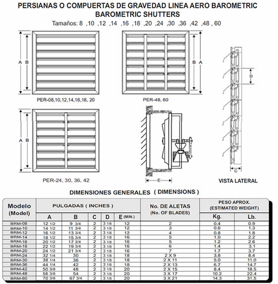 Persiana de sobre presión o barométrica, permite la ventilación del área sólo cuando se requiera. Adecuada para colocarse en el área de ventiladores, extractores axiales, centrífugos y cualquier otro equipo de ventilación.