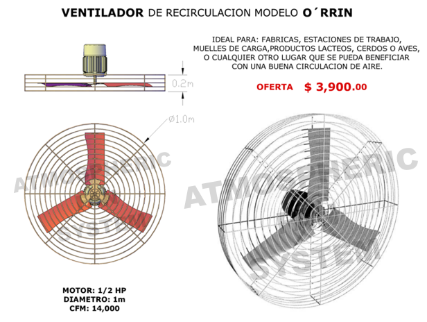 Ventilador de gran caudal (22,000 m3/hr) de hasta 40 plg de diámetro disponible con motor de 2 velocidades y protector térmico.