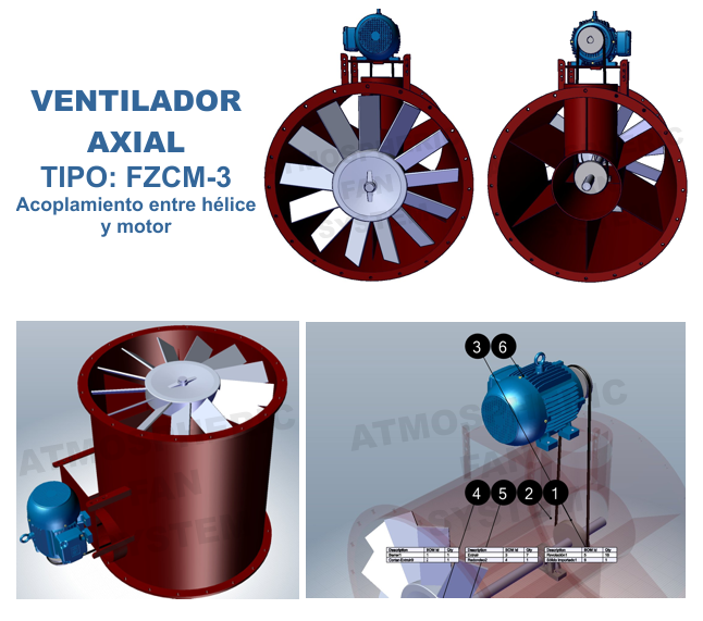 El acoplamiento entre hélice y motor es por medio de transisión de poleas y bandas. El diseño es adecuado para montaje en sistemas conductos.