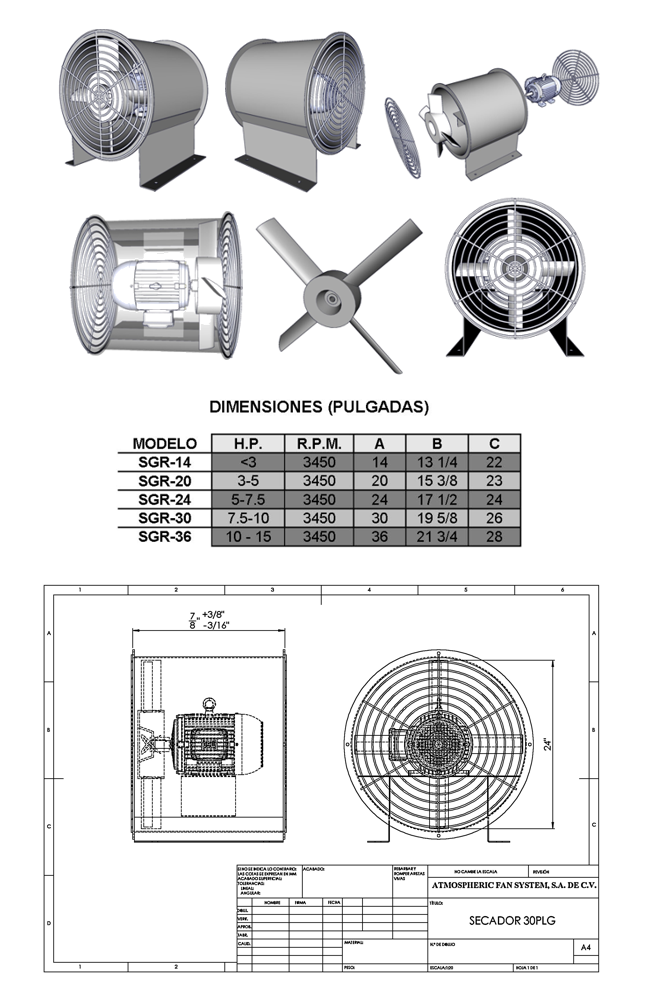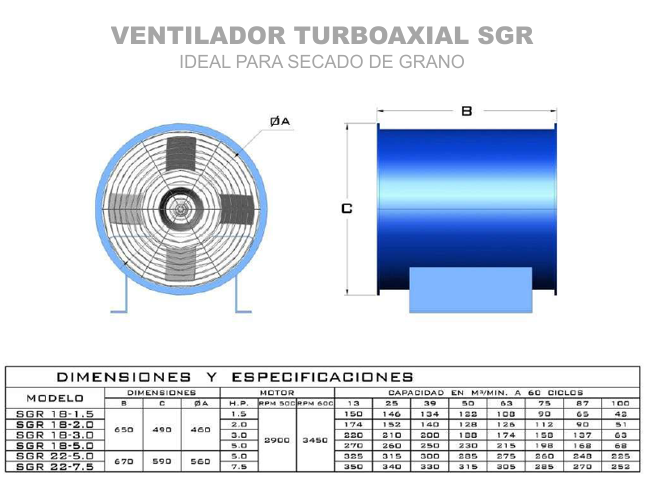 Ideal para secado de grano o sistemas que requieran presiones equivalentes hasta 100mm de columna de agua.